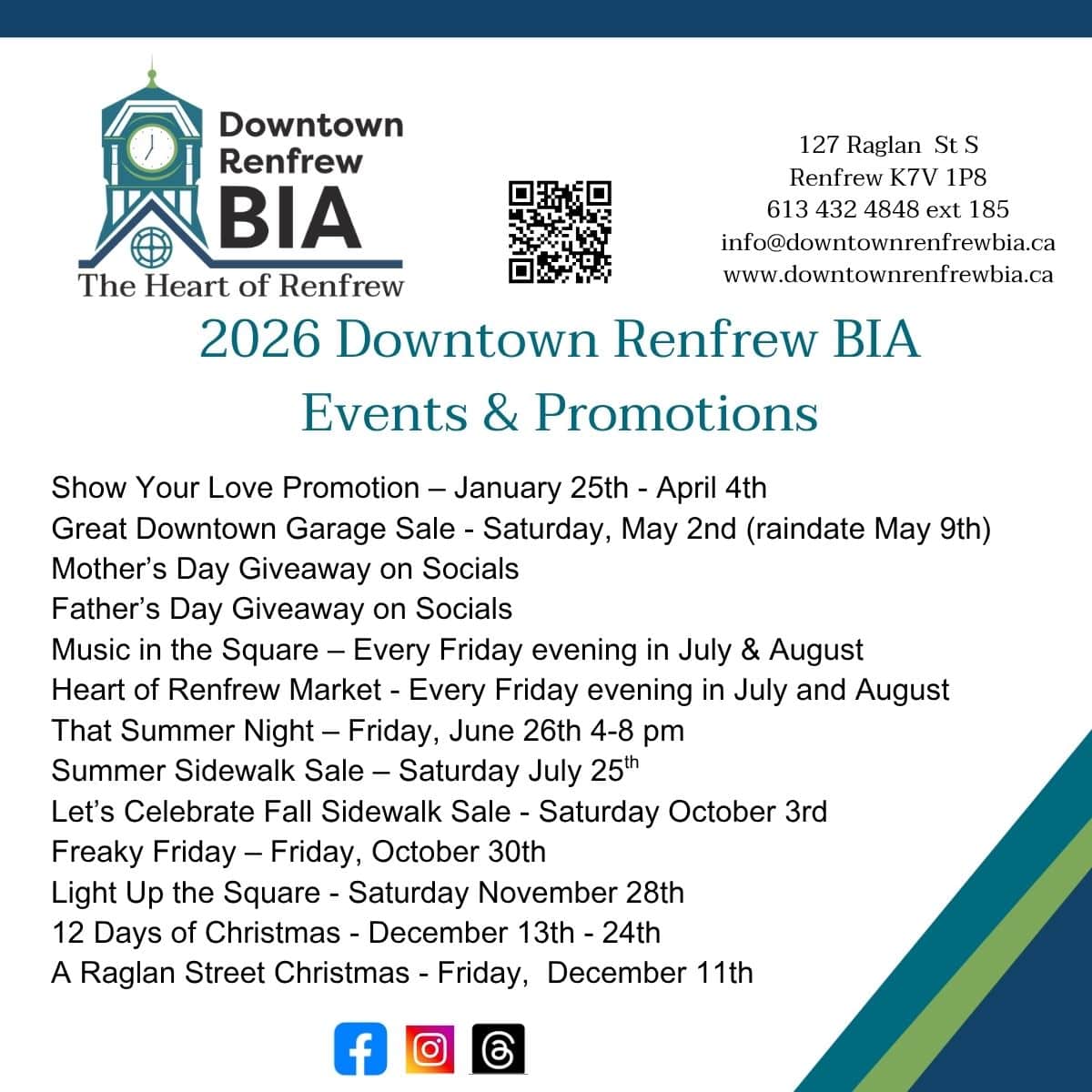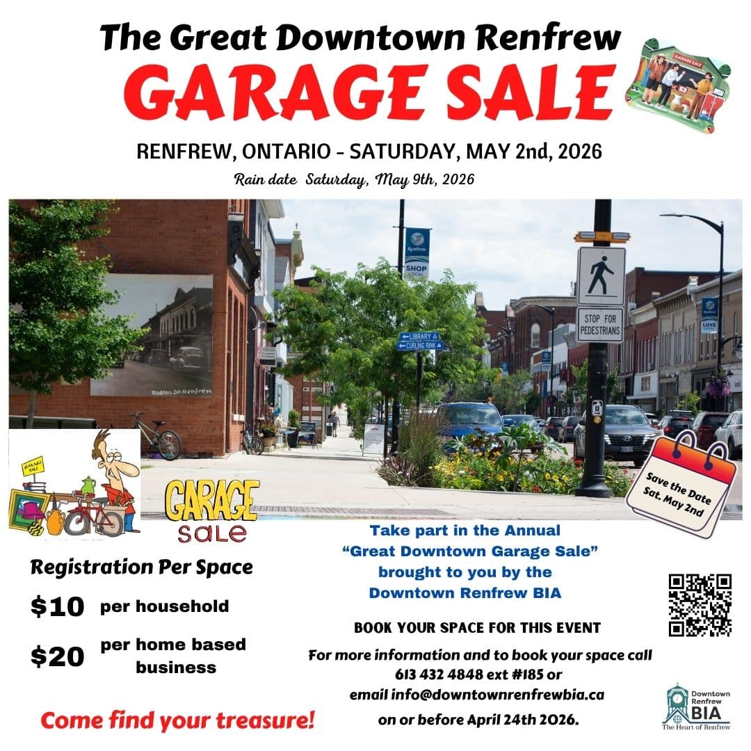 Nestled alongside the Bonnechere River, Renfrew is a thriving community filled with over 100 independent, locally owned businesses. These businesses provide important and vital services to the local population as well as those travelling along the triad of highways that intersect with the town. Downtown Renfrew’s Business Improvement Area (DRBIA) is fully committed to supporting our local businesses and making your shopping experience memorable. Our office is located at 127 Raglan Street South and is open on weekdays. Stop by for a visit!